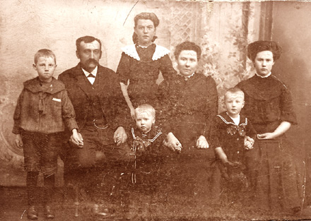 Billedet er af Hans Jørgen Jørgensen og hans familie. Den ældre dame er hans kone Anna Jensine Marie Jørgensen (født Henriksen), drengen længst til venstre i billedet er Jens Emil Jørgensen, den store pige bagerst i midten er Bodil Marie Jørgensen og pigen siddende længst til højre er Karen Valborg Jørgensen. Navnene på de to små drenge er usikre. Billedet er antaget til at være fra ca 1909. Hans Jørgen Jørgensen arbejdede bl.a. som arbejdsmand på Holeby Diesel, Holeby sukkerfabrik, og Maribo sukkerfabrik. I folketællingen 1921 ses han endvidere som Landarbejder. Familien har i årenes løb boet flere steder. Bl.a på Nyvej 5 i Holeby, og ifølge folketællingen for Skottemarke by 1906 i matr. nr. 20. Senere flytter familien til ovenstående hus på Skottemarkevej 29, og derefter blev det til Krønge. I 1921 finder man familien i Bursø matr. nr 34, hvor det formentlig har været et dobbelthus hvor deres ene datter Marie også har boet med sin mand Sofus Knudsen, og deres 2 børn Inger og Edith. Hans Jørgen og Anna Jensine blev begravet i Bursø, - hun i 1935, og han i 1940.