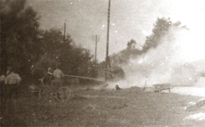 I den anden ende holder to mænd slangen og forsøger at slukke en brand i noget der ligner en ovn på hjul.