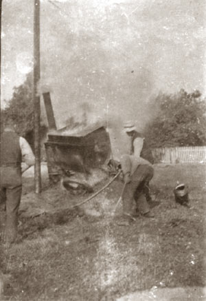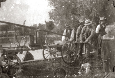 Brandsprøjten i aktion ved gadekæret. Tre mand pumper i den ene ende og formentlig lige så mange i den anden ende.