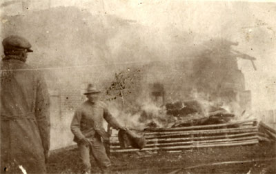 Ovenstående foto er taget ved branden af en ukendt gård. Stråtaget er allerede væk.