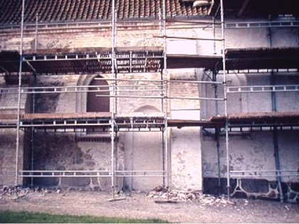 "Hans formand, der hed Mons Gøl skænkede klokkerne til Errindlev kirke i året 1607, tillige med døbefonden og altertavlen. Sidstnævnte blev dog i 1874 erstattet med en ny, da kirken havde fået en større reparation både ind- og udvendig, hvorved den blev cementpudset. Først var kirken hvidkalket, men da den var muret med røde sten blev den helt flakket når der fløj lidt kalk af. Så blev den kalket råd, men det så heller ikke godt ud, for når der falder en plade cement af og skaden skal udbedres, ligner det nye puds ikke det gamle så kirken altid ser ud, som den var bødet med klude". Peter E. Poulsen beskriver restaureringen således: