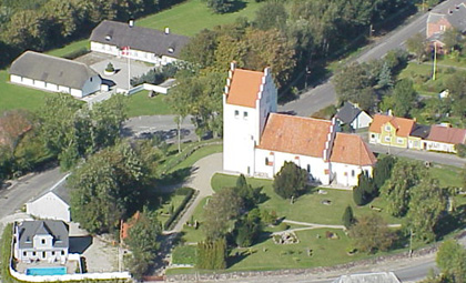 Kirken efter restaureringen i nyere tid med præstegården i baggrunden. |